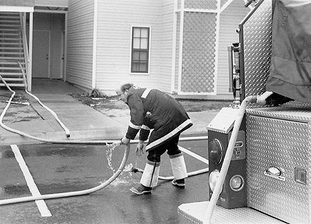 Greg McPhail rolls up hose that, luckily, was not needed. A